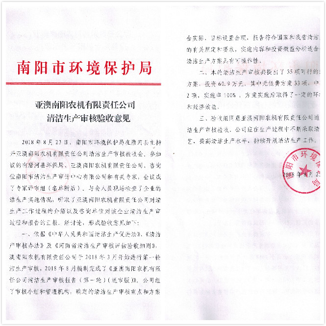 8月23日南陽市清潔生產(chǎn)審計中心攜權(quán)威認(rèn)證專家對我公司清潔生產(chǎn)情況進行審核,會議上,專家對我公司清潔生產(chǎn)情況給予高度評價,一致認(rèn)定亞澳農(nóng)機通過清潔生產(chǎn)審核,同時也為公司后續(xù)清潔生產(chǎn)提出一定要求及需改進的地方。我公司副總表示,接受專家們的建議,后續(xù)公司在清潔生產(chǎn)方面也將不斷改進。