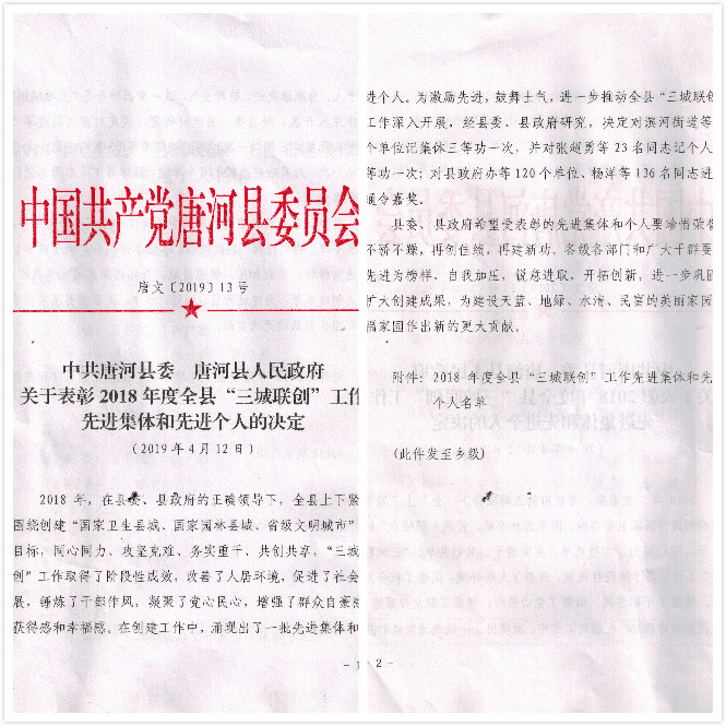 4月12日,唐河縣召開2018年度“三城聯(lián)創(chuàng)”總結(jié)大會(huì)。大會(huì)宣讀了表彰先進(jìn)集體及先進(jìn)個(gè)人的決定。亞澳農(nóng)機(jī)獲得2018年度國家園林縣城創(chuàng)建工作先進(jìn)集體。