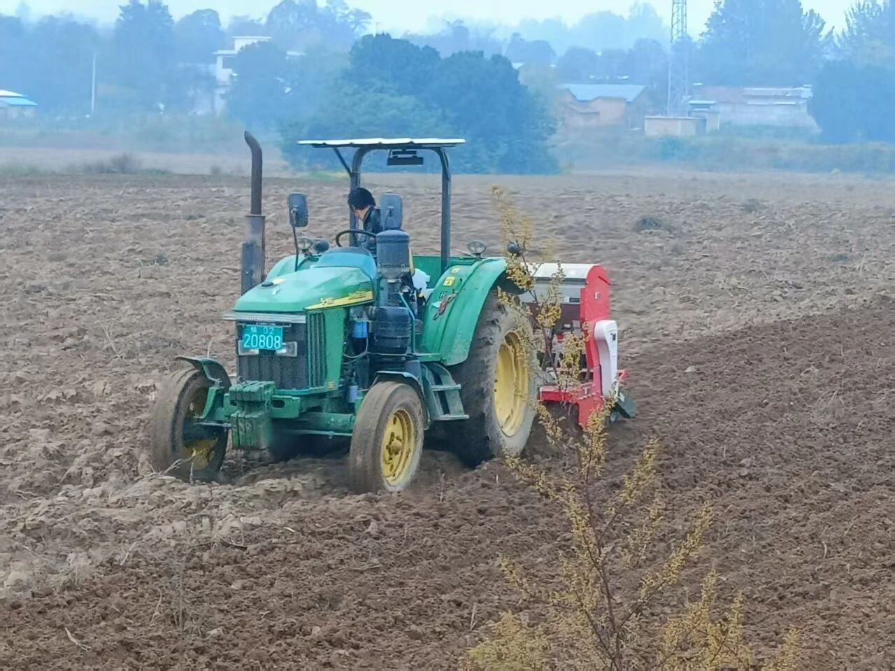 在百公里外的銅川市耀州區(qū)小丘鎮(zhèn)中原村,亞澳農機同樣成為搶種主力。“播種期推遲了近十天,土壤又濕,最怕播深不均和倒伏。”農機手操控著亞澳寬幅溝播機穿梭田間,機具搭載的指夾式排種器實現(xiàn)精準下種,配合可調節(jié)播深系統(tǒng),將播種深度嚴格控制在2—4cm的最佳范圍,既滿足銅川市農機推廣站副站長姚關盈提出的“淺播搶積溫”要求,又通過均勻播種避免了“播量過大易倒伏”的風險。截至目前,銅川市已調度1600余臺套農機投入秋播,亞澳機具憑借“旋耕、播種、施肥一體化”優(yōu)勢,大幅提升了濕墑地塊的作業(yè)效率,助力農戶把延誤的農時搶回來。