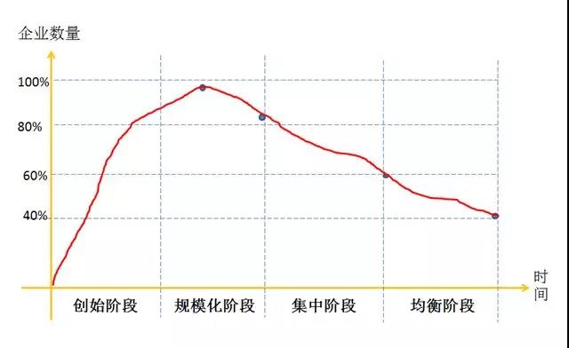 在一個行業(yè),從長期看,企業(yè)要存活下來就要有超出平均水平的成本控制能力。管理學家陳春花認為一個行業(yè)內(nèi)企業(yè)數(shù)量和時間軸之間的關(guān)系可以通過四個發(fā)展階段來說明:初創(chuàng)階段、規(guī)模化階段企業(yè)數(shù)量一直上升,規(guī)模化后期企業(yè)數(shù)量達到頂峰,開始有擠出效應(yīng),約20%企業(yè)出局,到集中階段又有20%企業(yè)出局,到均衡階段還要淘汰20%,最后的競爭就在剩下的40%企業(yè)之間展開。