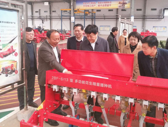 參觀過程中,劉樹華部長親切的向郭總咨詢公司的產品,郭總向劉樹華部長簡述了2BF-6/13 多功能花生精量播種機的功能構造,在得知該款機型當年投產當年熱銷后,劉部長十分高興的對郭總說:“亞澳要進一步開展科技研發(fā)工作,多培養(yǎng)、招聘科研人員,增強自身科研力量,成為農機具行業(yè)的標桿”,周天龍縣長對劉樹華部長說:“縣政府已批給亞澳30多畝土地,作為亞澳的科技研發(fā)中心”。